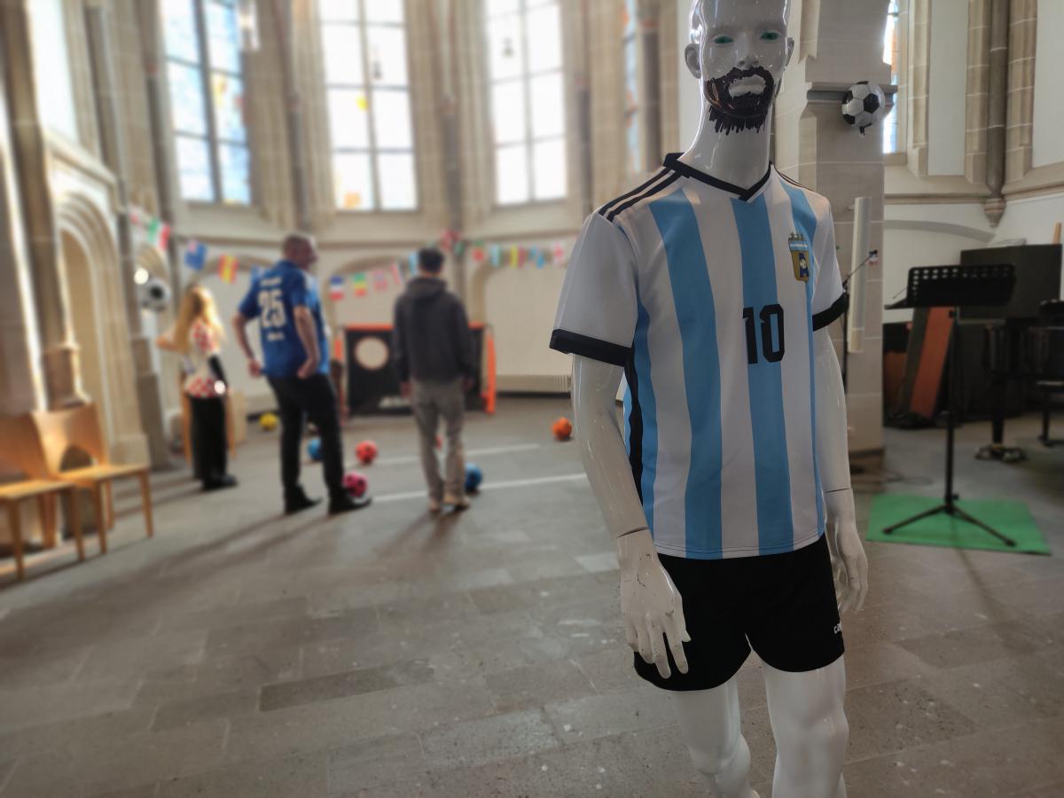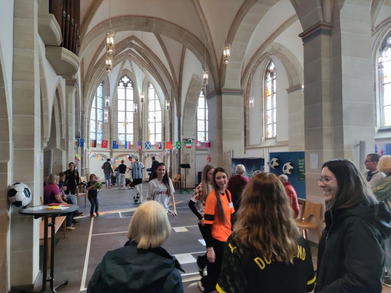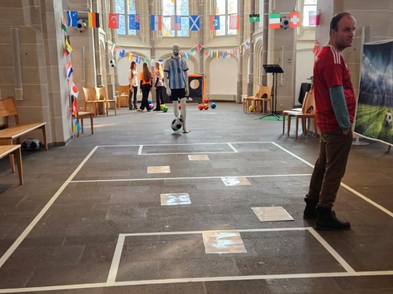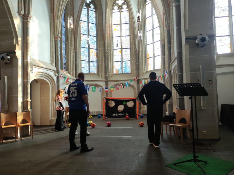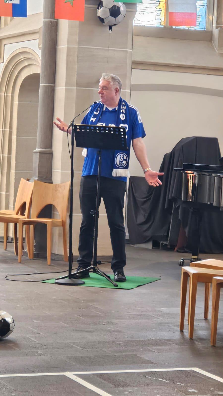 In diesem Jahr findet wieder eine Fußball-WM statt, in den USA, Kanada und Mexiko. Daher das Thema „Eine runde Sache“. Runde 80 Menschen waren in der Dorfkirche Repelen, die diesmal alles zum Thema Fußball zu bieten hatte. Eine Torwand, fangesänge, geleb und rote Karten. In den Kurzpredigten verknüpfte Pfarrer Thorsten Kämmer Elemente aus dem Fußball mit Bibelstellen: "Ein großes Fußballfeld mitten in der Kirche. Aber dieses Feld dient nicht nur der Optik, sondern es lädt ein die einzelnen Positionen, die die Spieler im Spiel einzunehmen, kennen zu lernen und darüber mit sich selber ins Gespräch zu kommen. Wir haben zu Beispiel den Torwart. Die Hauptaufgabe des Torwartes ist natürlich Tore zu verhindern, wenn der Ball plötzlich auf einen zufliegt, wenn ein Spieler alleine auf einen zuläuft oder eben vor einem Elfmeter und da stellt sich die Frage: Wie fühlt es sich an, wenn ich alleine vor großen Entscheidungen stehe? Natürlich ist der Torwart Teil des Teams, aber wenn der Ball reingeht, wird sofort bewertet: war er haltbar oder nicht? Da kommt es ihm so vor, wie dem Volk Israel, dem im 5. Buch Mose 11,26 gesagt wird: „Nun müsst ihr euch entscheiden: Wählt zwischen Segen und Fluch!“